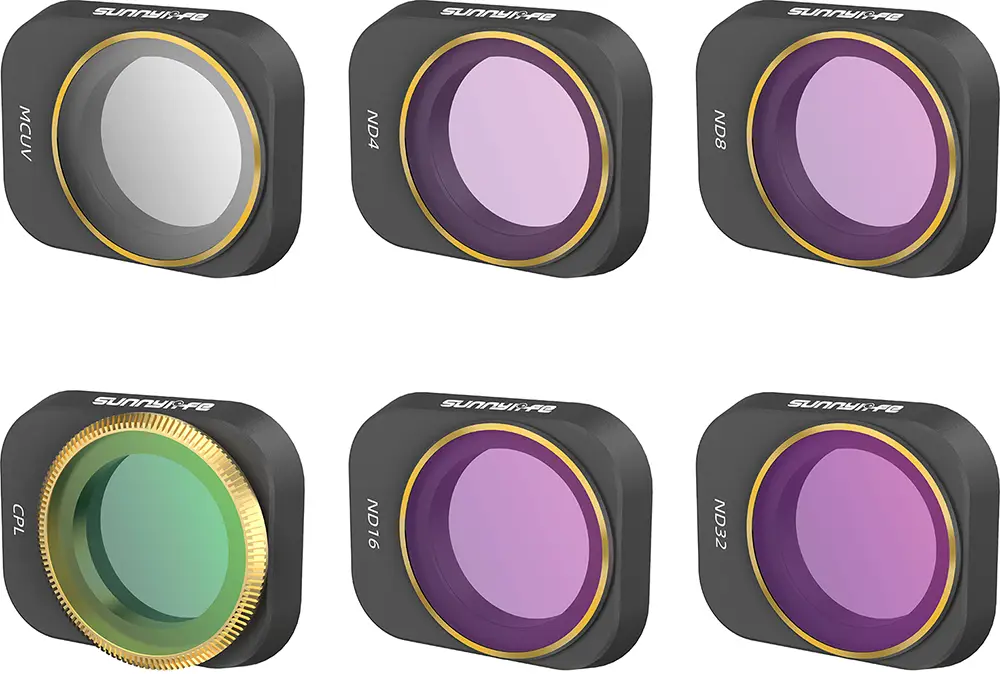 Neutraldichte- (ND) und Polarisationsfilter (PL) für Drohnenkameras reduzieren und/oder filtern die einfallende Lichtmenge. Bei richtiger Anwendung erzeugen ND/PL-Filter sattere Farben und stärkeren Kontrast (wie Wolken vor klarem Himmel). Videos werden durch die optimale Verschlusszeit in Kombination mit der Bildrate (Bilder pro Sekunde) flüssiger und filmischer. Objektivfilter schützen Ihr Kameraobjektiv zudem vor Kratzern und Staub.