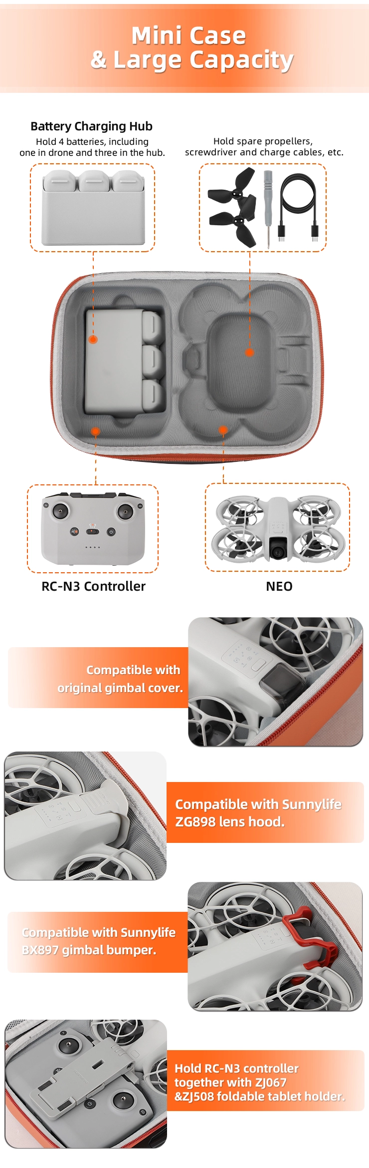 Diese Schutztasche wurde speziell für die Bedürfnisse von Benutzern der DJI Neo-Drohne entwickelt. Die geräumigen Fächer bieten Platz für alles notwendige Zubehör, einschließlich zusätzlicher Propeller, Speicherkarten und Ladekabel. Sie müssen nichts zurücklassen; Alles, was Sie brauchen, passt in eine kompakte, gut organisierte Tasche.
