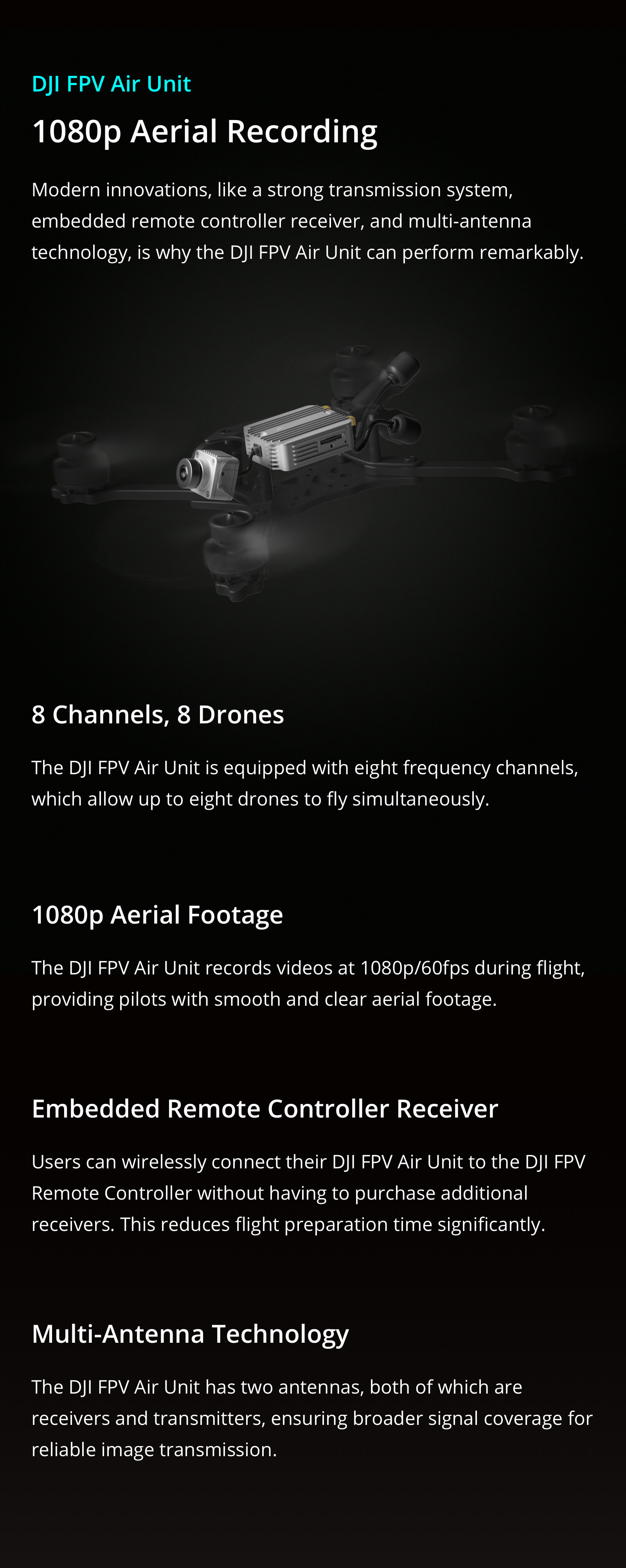 Met de DJI FPV Fly More Combo ontvang je de FPV Goggles, FPV Air Unit (met camera) en een DJI FPV remote controller. Het enige wat je hoeft te doen is de compacte, lichte FPV Air Unit op je favoriete race quad in te bouwen en je bent binnen no-time klaar om te racen!