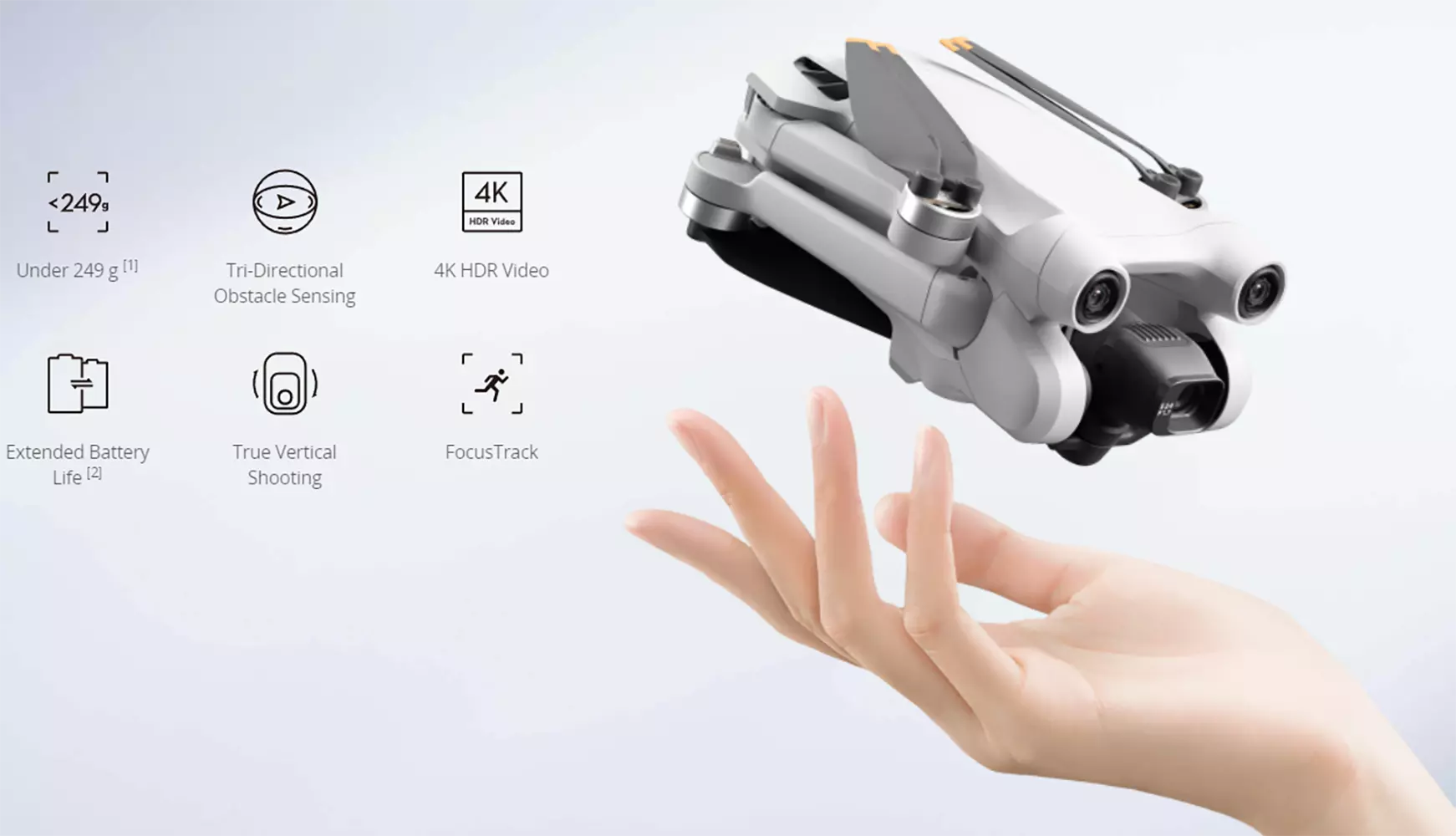 1. Standard aircraft weight (including DJI Mini 3 Pro Intelligent Flight Battery, propellers, and a microSD card). The actual product weight may vary due to differences in batch materials and external factors. Registration is not required in some countries and regions. Check local rules and regulations before use.