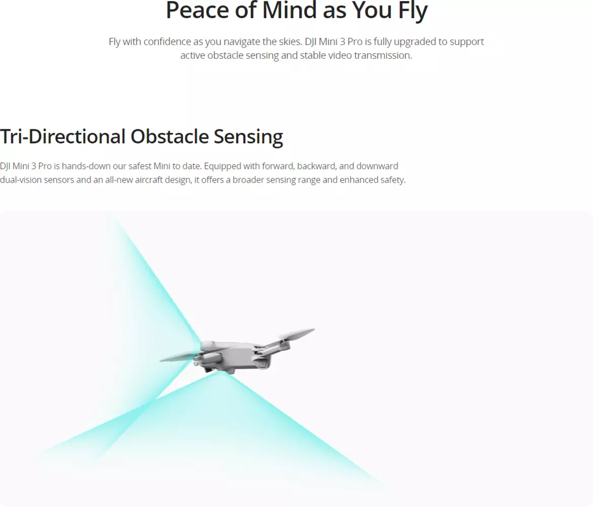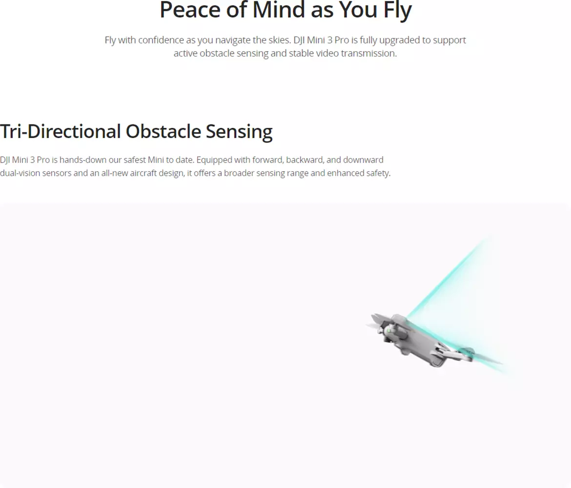 2. Broader environment sensing range: The new design enables the drone to carry sensors with a larger FOV, further increasing the sensing range and distance. DJI Mini 3 Pro thus provides more powerful visual sensing capabilities, improving flexibility and safety during flight and obstacle avoidance.