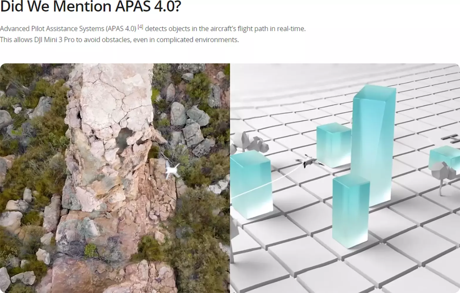 With forward, backward, and downward vision sensors, ToF, and APAS 4.0 [2], Mini 3 Pro can avoid obstacles, even in complicated environments.