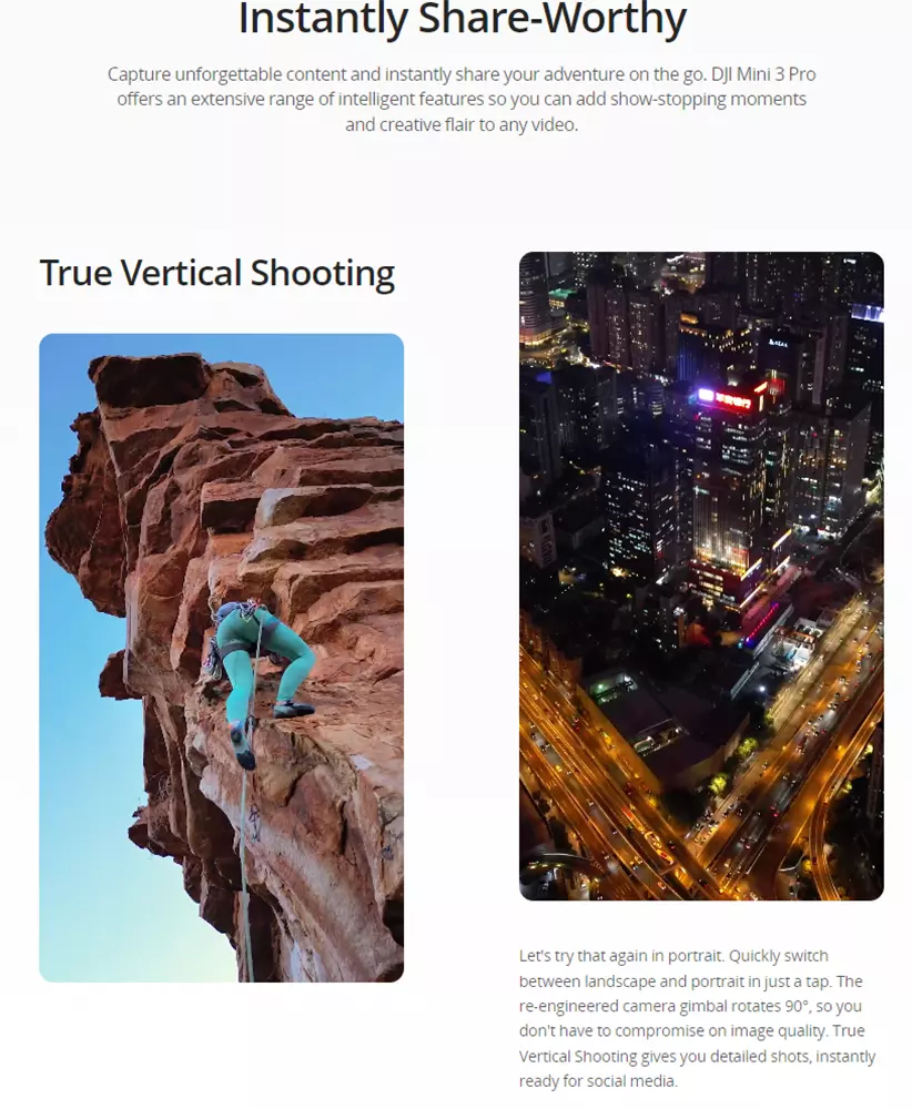 3. True Vertical Shooting and expanded axes: The new design allows users to get portrait shots without the need for digital cropping. Fewer gimbal limits mean more shooting angles and added creative freedom. During high-speed flight, the aircraft angle also has less restrictions on the gimbal and the shooting angle.