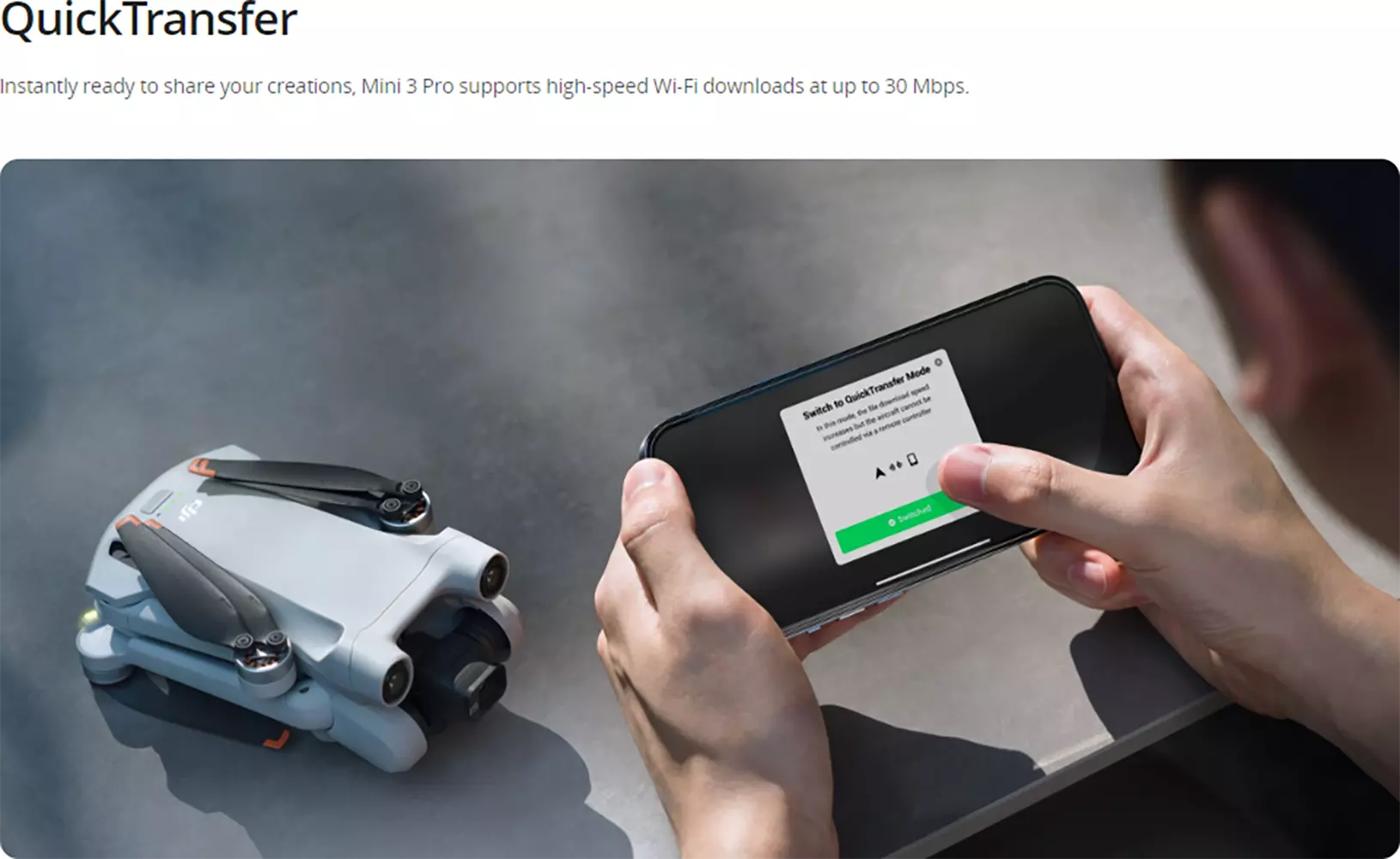 DJI Mini 3 Pro’s High-Speed QuickTransfer supports the fast transmission of photos and videos at up to 30MB/s.