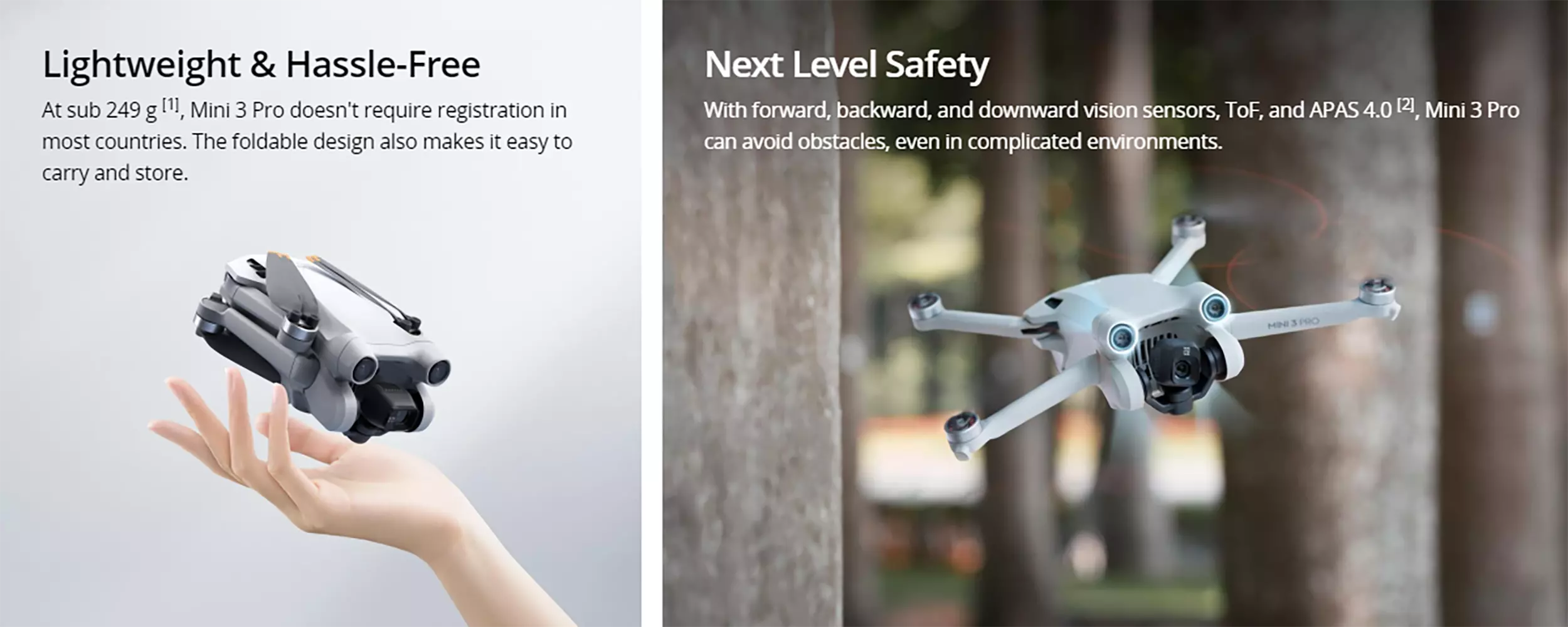 At sub 249 g [1], Mini 3 Pro doesn't require registration in most countries. The foldable design also makes it easy to carry and store.