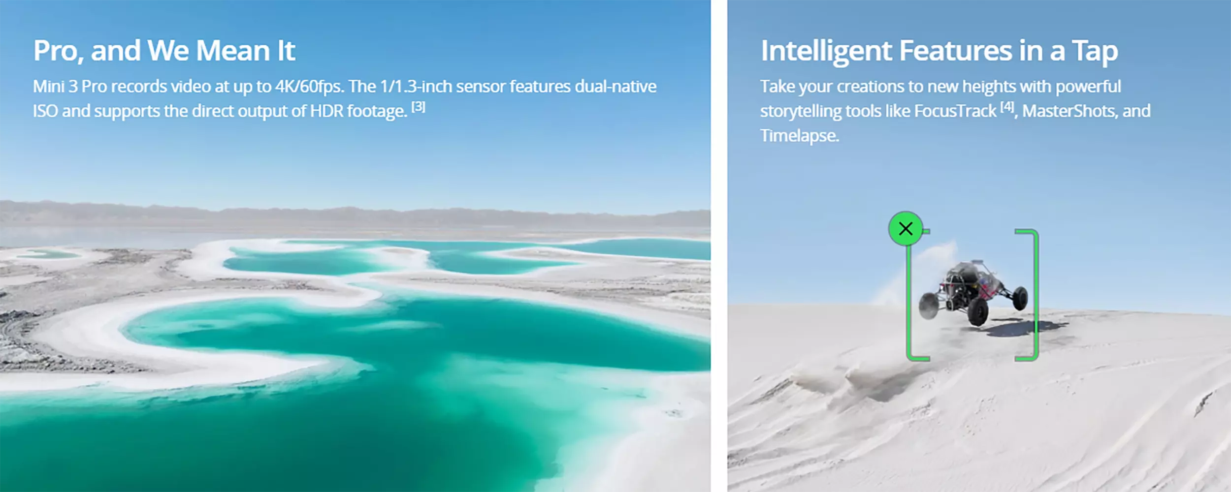 Mini 3 Pro records video at up to 4K/60fps. The 1/1.3-inch sensor features dual-native ISO and supports the direct output of HDR footage. [3]